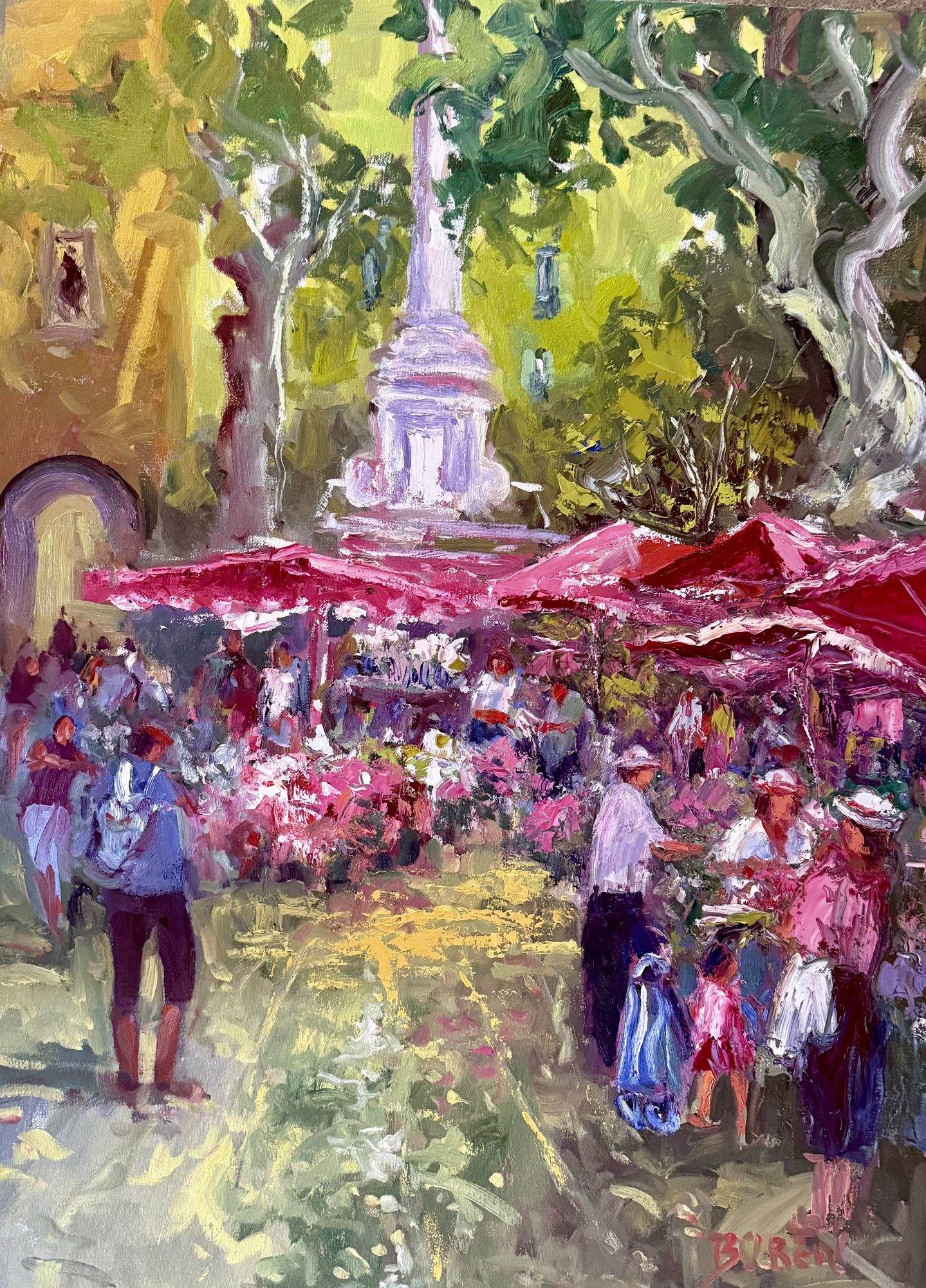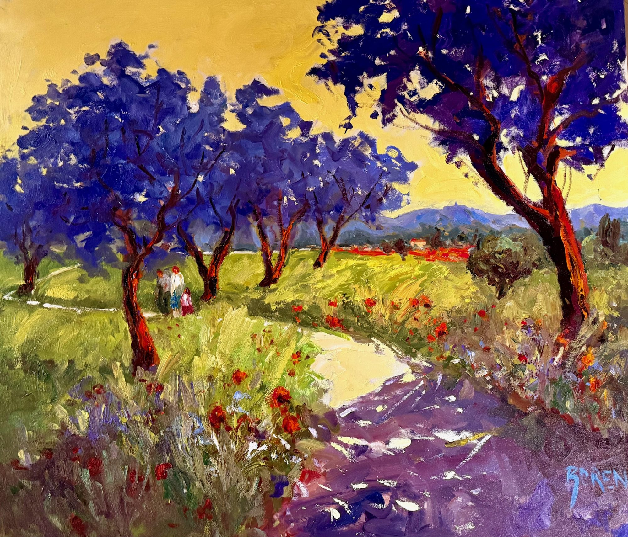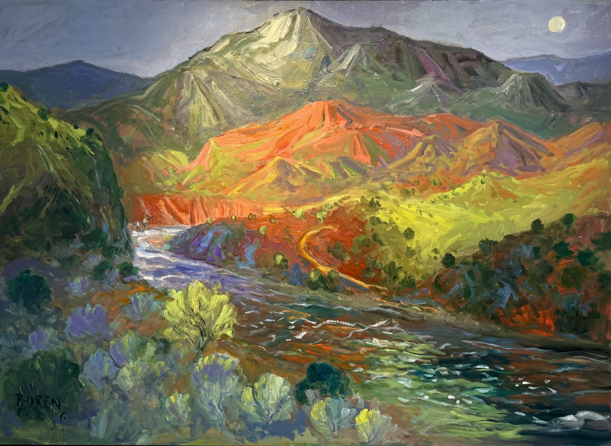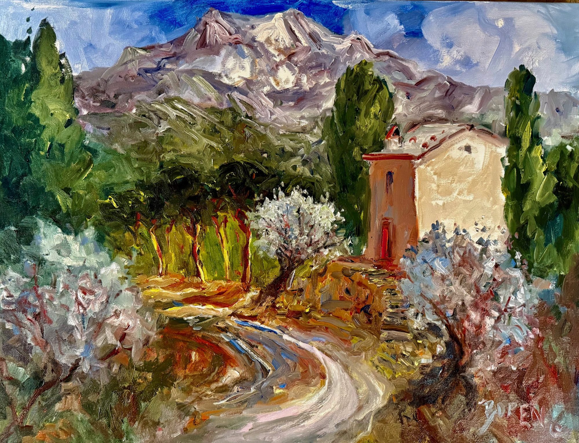 I work through sketches and color studies so that when I start putting pigment on canvas I know where I want the painting to go. I mix my limited palette and work wet into wet moving the paint with my knives. I work from thin layers of paint to thicker more textured layers. My own feelings and excitement for the subject come through in a fresh and pleasing way. I listen to my inner feelings and go with the flow as I do in painting my watercolors. I want to be sure not to over work